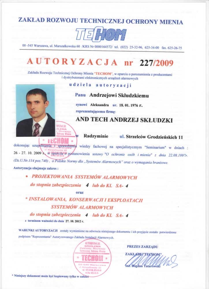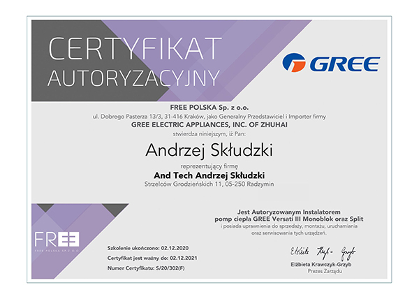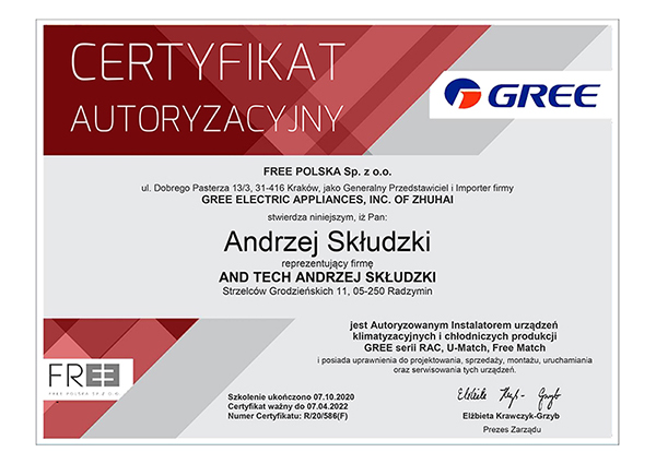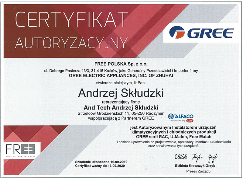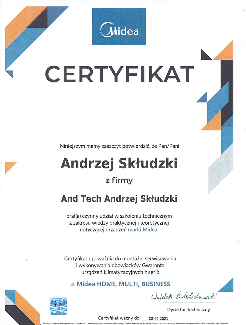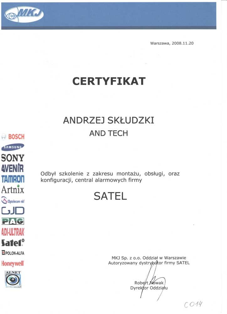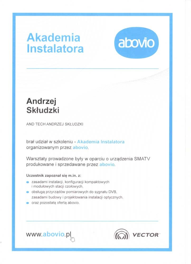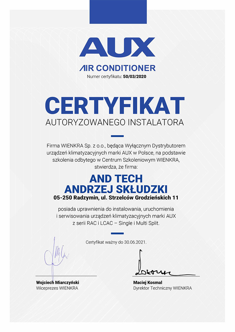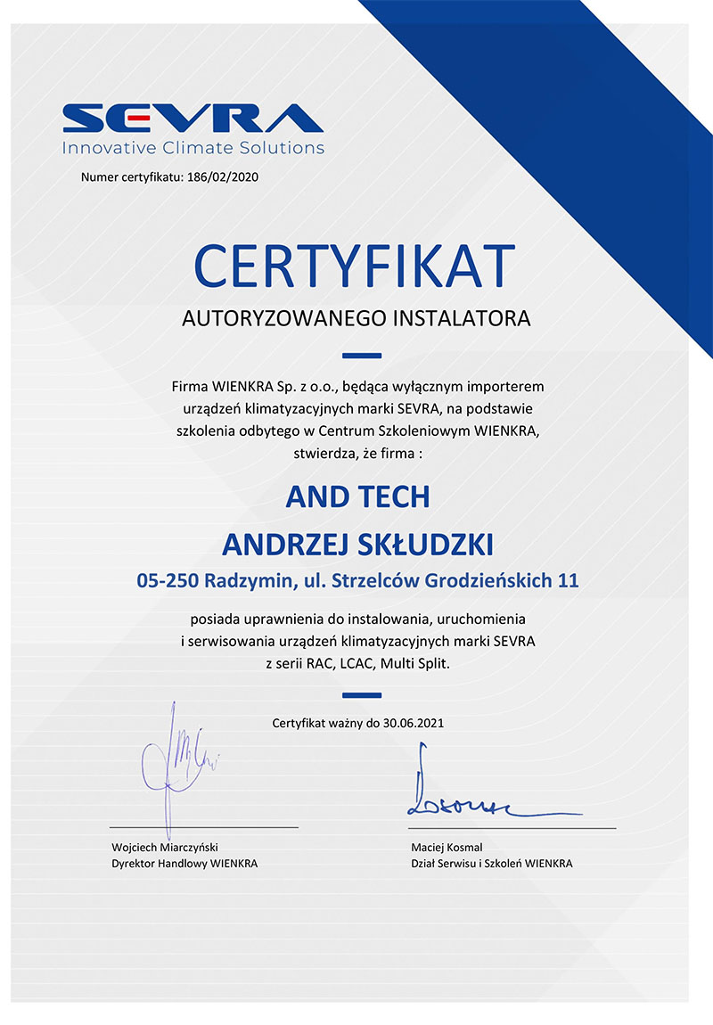 AndTech to firma ciesząca się pełnym zaufaniem. Podnosimy jakość naszych usług poprzez regularne szkolenia z zakresu montażu i obsługi najnowszych urządzeń dostępnych na rynku. Poniższe certyfikaty potwierdzają oferowaną przez nas gwarancję jakości.
