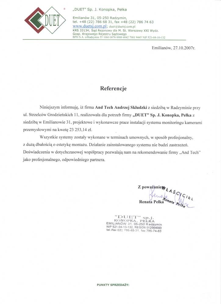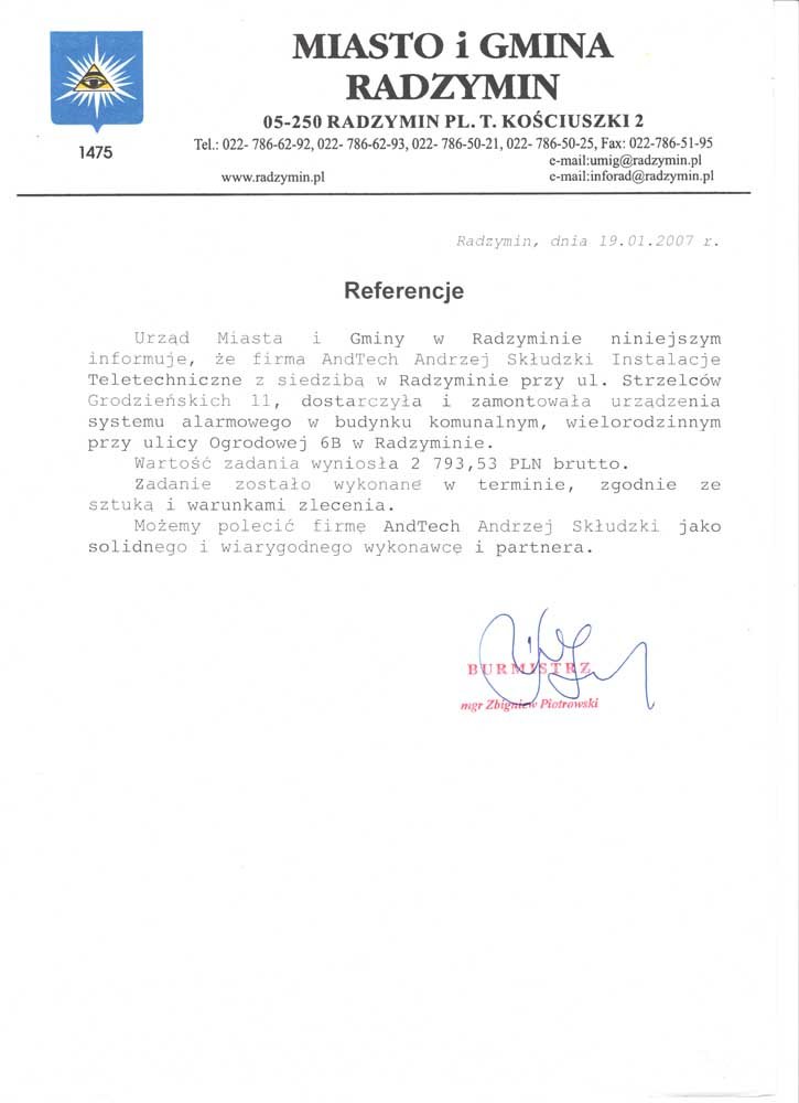 Informuję, że firma AndTech z Radzymina realizowała dla nas projektowe i wykonawcze prace instalacji systemu monitoringu kamerami przemysłowymi na kwotę 23 253 zł.