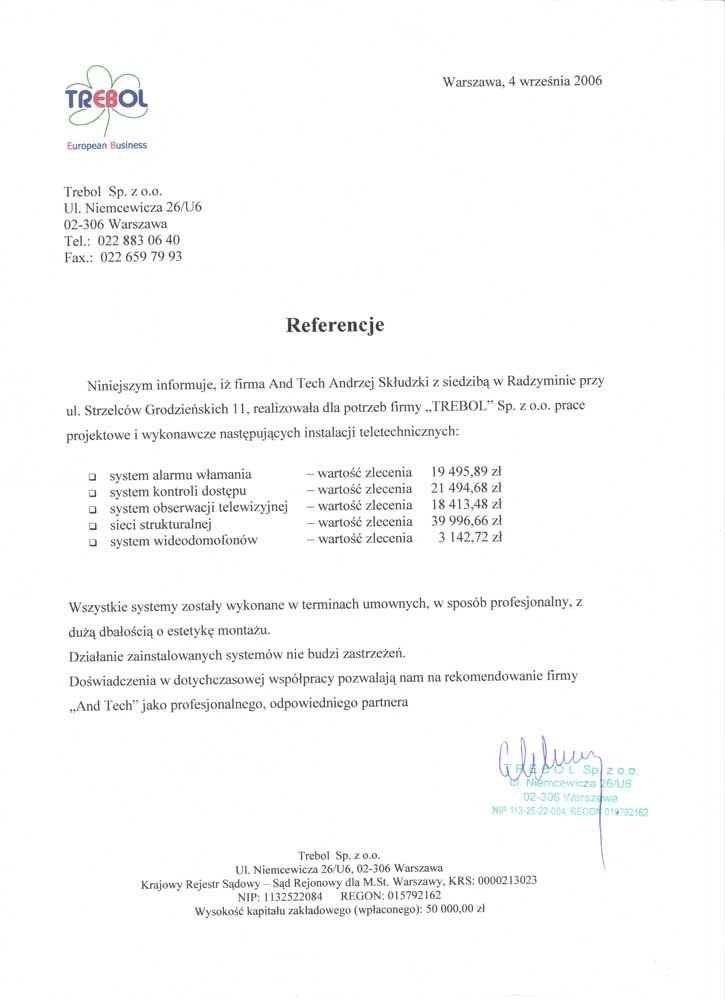 Firma AndTech z Radzymina realizowała dla firmy Trebol z Warszawy prace projektowe i wykonawcze następujących instalacji teletechnicznych: system alarmu włamania, system kontroli dostępu, system obserwacji telewizyjnej, sieci strukturalnej, systemu wideodomofonów.