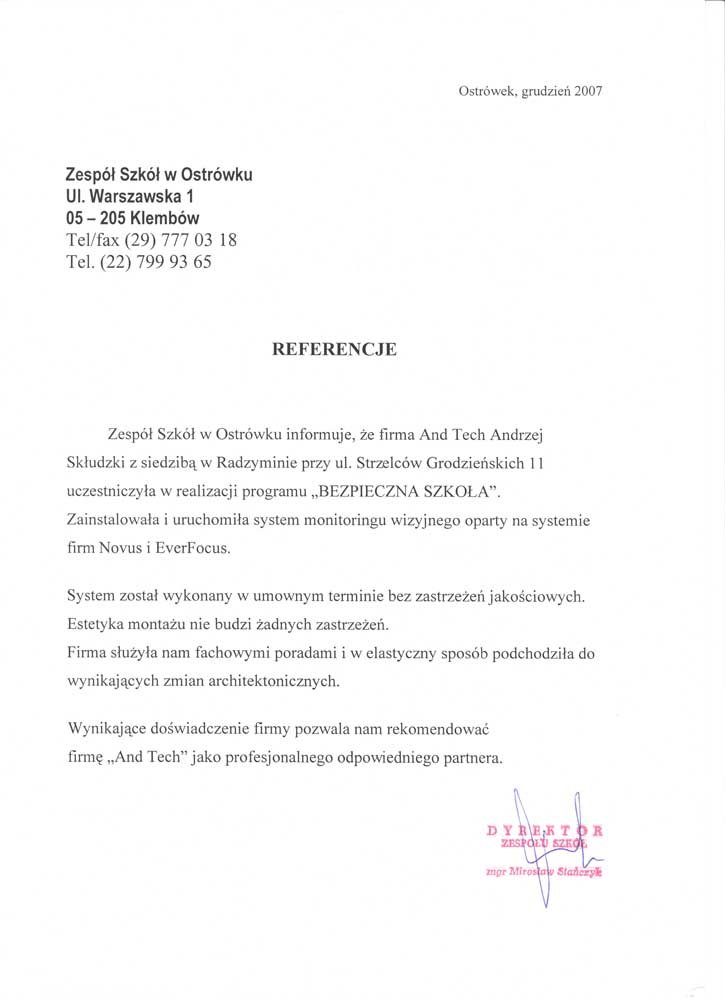 Informujemy, że firma AndTech z siedzibą w Radzyminie uczestniczyła w realizacji programu "Bezpieczna"Szkoła. Zainstalowała i uruchomiła system monitoringu wizyjnego oparty na systemie firm Novus i EverFocus.